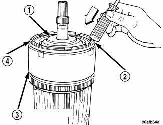 2. Tap down reverse clutch reaction plate (4) to release pressure from snap ring (2).